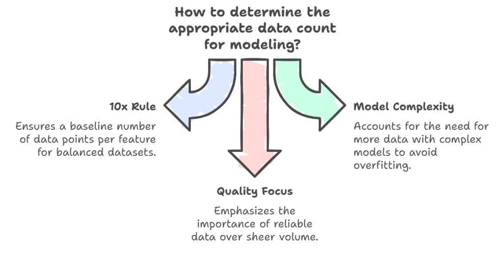 - The “10x Rule” (Not so sure about that!): A common guideline suggests you need at least 10 data points per feature. If your dataset has 10 features, a reasonable baseline would be 100 data points.