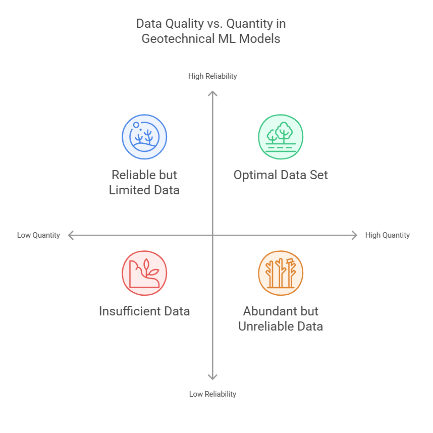 - Geotechnical Knowledge & Context: Data volume alone doesn’t define a model’s success. Instead, we must evaluate whether the data adequately represents the problem and whether it captures meaningful patterns.